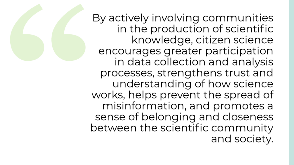 Science is often perceived as a field that is difficult for much of the population to access and understand. It is frequently seen as an exclusive space reserved for certain groups, which has created a sense of distance that, in recent years, has fueled skepticism and distrust toward its findings—even on widely studied issues such as climate change and the role of human beings in this process. In this context, by actively involving communities in the production of scientific knowledge, citizen science encourages greater participation in data collection and analysis processes, strengthens trust and understanding of how science works, helps prevent the spread of misinformation, and promotes a sense of belonging and closeness between the scientific community and society.