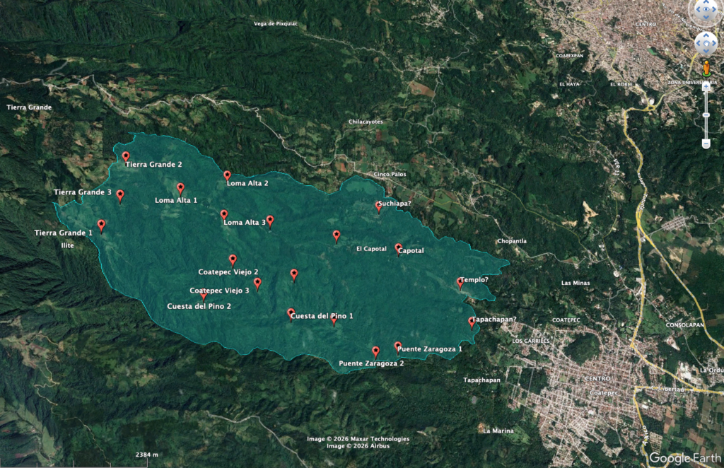 Figure 1: The area belongs to the municipality of Coatepec, with the municipal seat and the nearest urban area visible to the southeast. The state capital, Xalapa, is visible to the northeast. Red points represent small settlements or hamlets within the region: Loma Alta (L), Dos Caminos (2), Cruz de Duela (C), Coatepec Viejo (V), and Hayas Cuatas (H), as well as several others whose names are still being identified (*). A continuously updated map is available at the following link: municipality of Coatepec.
