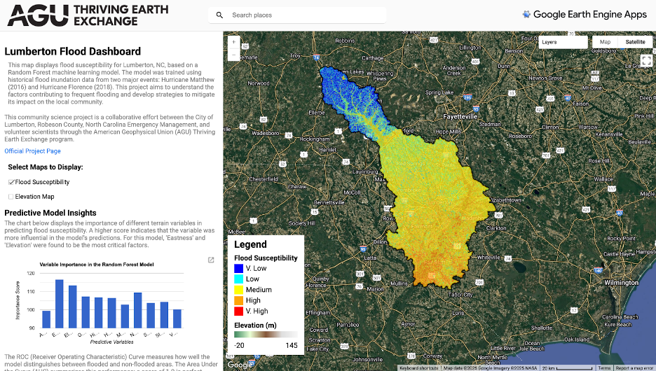 The primary outcome of this collaboration is the development of the Lumberton Flood Dashboard, an interactive, web-based tool powered by Google Earth Engine. The team utilized a Random Forest machine learning model trained on flood data from the 2016 and 2018 hurricanes. Rather than focusing on abstract terrain statistics, the project prioritized the creation of a high-resolution Flood Susceptibility Map. This map visualizes the landscape of Lumberton, color-coding areas from “Very Low” to “Very High” susceptibility.