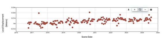Over the past 10 years, the site’s displacement remained relatively stable, fluctuating only by a few millimeters around zero. The 10-year time series (Figure) indicates that most LOS displacement values stayed within roughly ±0.003 m (±3 mm) of the baseline. These minor oscillations can be attributed to measurement noise and any small seasonal or long-term ground motions. InSAR measurements from Sentinel-1 typically achieve millimeter-level precision (Fattahi et al., 2024), and the OPERA displacement product is designed to meet accuracy on the order of ~5 mm/year (Staniewicz et al., 2025). In practical terms, random noise in an InSAR time series is on the order of a few millimeters for each measurement (Fattahi et al., 2024). Thus, the normal “background” scatter in the Palmer Township record (on the order of 1–3 mm) is consistent with the expected noise floor.