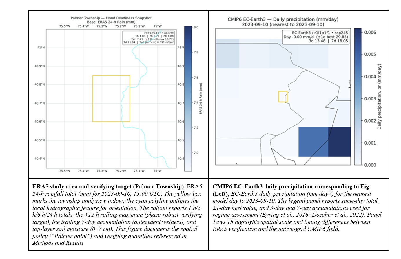 All diagnostics were evaluated at the nearest available ERA5 grid to Palmer Township, two latitude rows at 40.60° and 40.85° N and a single longitude at −75.35° W, hereafter “Palmer point,” to maintain internal consistency with the available reanalysis coverage. ERA5 tp (metres) was converted to millimetres (×1000). For mapping and tables, “rain_mm” denotes total precipitation (water-equivalent) accumulated from tp increments and expressed in millimetres, aligning units with CMIP6 daily precipitation (pr, converted to mm day⁻¹ by ×86 400). The roster of objective cases was generated automatically from ERA5 calendar-day totals: one top-percentile wet day per season, three moderate days covering cool, warm, and transition months, two dry controls contrasting soil states, and a fixed comparator date (15 May 2024). The roster and associated ERA5 diagnostics were written to reproducible tables.