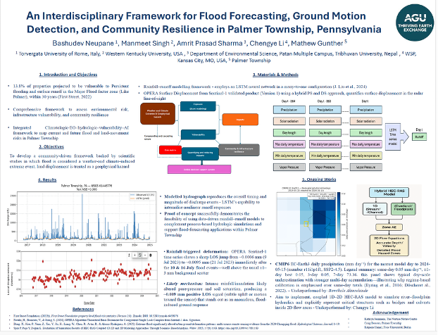 The interdisciplinary project team worked with Palmer Township, Pennsylvania, which is already coping with flooding, drainage problems, and a quieter but important risk: slow ground movement. The team evaluated flood risk and climate-related ground conditions and produced decision-ready materials by assembling open datasets (ERA5 precipitation and temperature, satellite-derived flood evidence, and displacement time series), computing 1980–2024 seasonal and annual means and trends, and preparing screening-level inundation scenarios for priority corridors such as key roads and creek-adjacent areas. The workflow followed three core steps: (1) rigorous data ingestion and QA/QC; (2) spatial and statistical analysis to detect trends and assess significance; and (3) scenario mapping using simplified hydraulic screening to illustrate where floodwater is most likely to spread under different storm conditions.