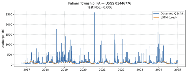 The modelled hydrograph reproduces the overall timing and magnitude of discharge events, reflecting the LSTM’s capability to internalise nonlinear runoff responses driven by meteorological variability. However, discrepancies remain during high-flow peaks and recession limbs, indicating the need for improved calibration, incorporation of additional catchment attributes (e.g., soil moisture, land cover, antecedent wetness), and possibly hybrid modeling with physical constraints. Nevertheless, the proof-of-concept successfully demonstrates the feasibility of using data-driven rainfall–runoff models to complement process-based hydrologic simulations and support flood-forecasting applications within Palmer Township.