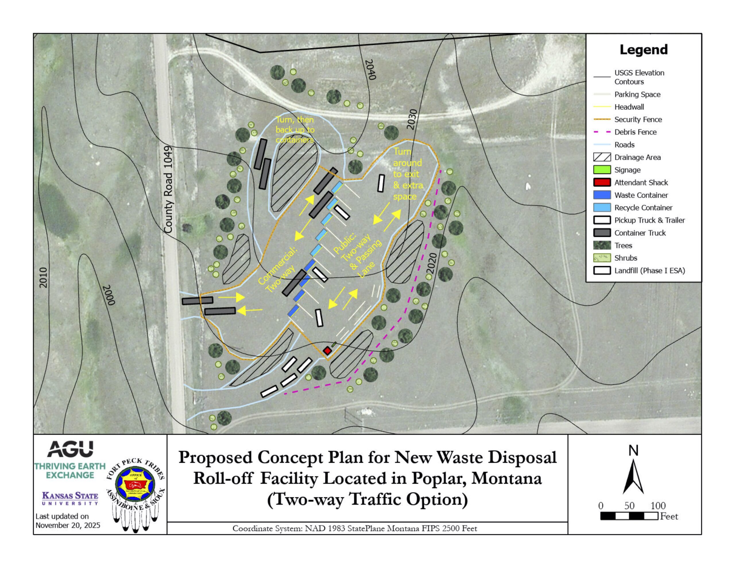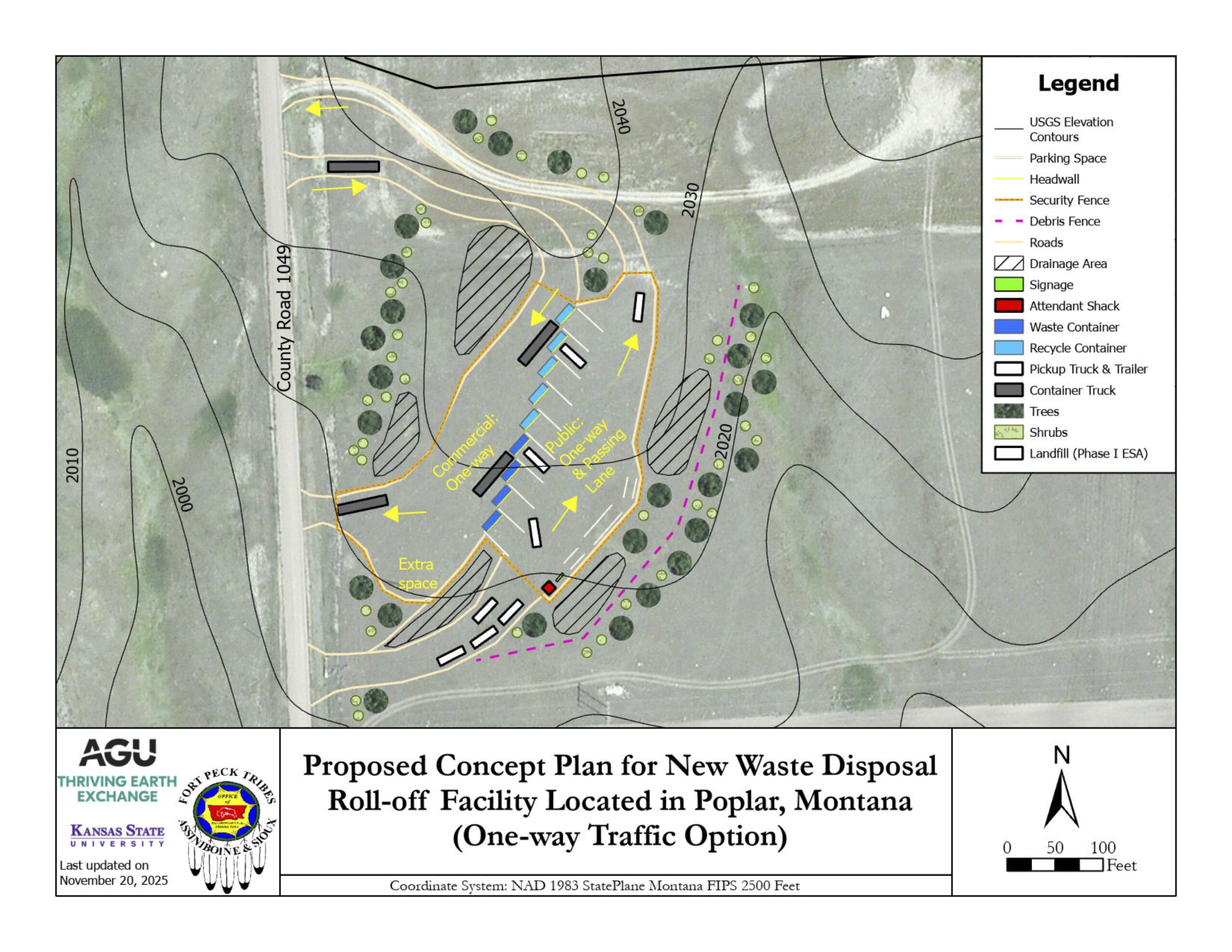 Poplar, Montana is a town of about 800, located in northeastern Montana within the Fort Peck Assiniboine and Sioux Indian Reservation. The goal of this project was to facilitate moving the town’s roll-off site away from its current location, where it is eroding into the Missouri River. Specifically, this project hoped to create a conceptual design for a new roll-off site that would be informed by community priorities and located in an ecologically stable spot. This project recruited a community planner and an engineer, one of whom was on the AGU-TEX list of interested scientists, and the other of whom answered an email sent based on his published work and areas of expertise. A new roll-off location was chosen via community conversations, GIS work, and the approval of the Tribal Executive Board. The project team sent out a community survey to receive input on roll-out site use patterns, current issues, and future requests. This survey received about 55 responses, all of which helped to inform design priorities. It was publicized in a variety of forms, ranging from QR code flyers to tabling at local events. The Community Leads also asked their friends, coworkers, and others for informal feedback in order to broaden responses. After compiling survey responses, Phase I assessment data of the chosen new site, and as much information as possible about environmental conditions, the scientists began to draw draft layout options for feedback from the Community Leads and community members who will be directly working at the roll-off station. The team has now developed three slightly different design options to choose from, all sited in the most logical location. This will allow a local engineering firm to refine community-vetted designs and to start site work without much preliminary effort.